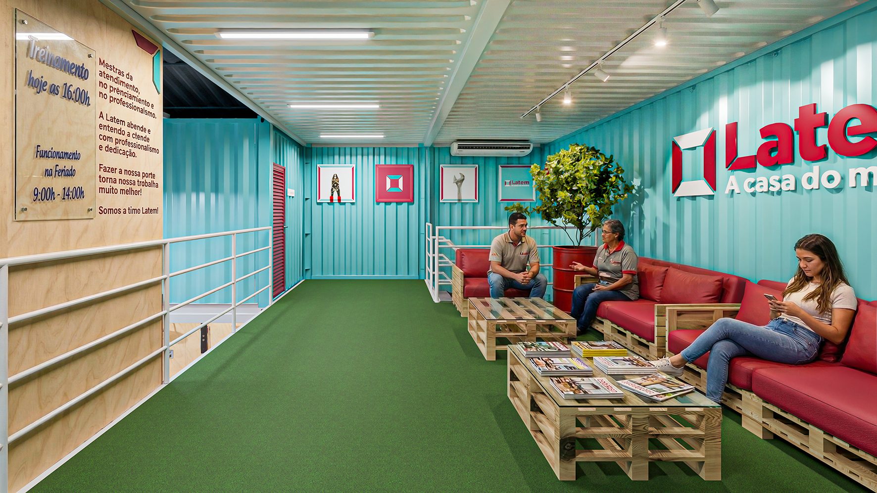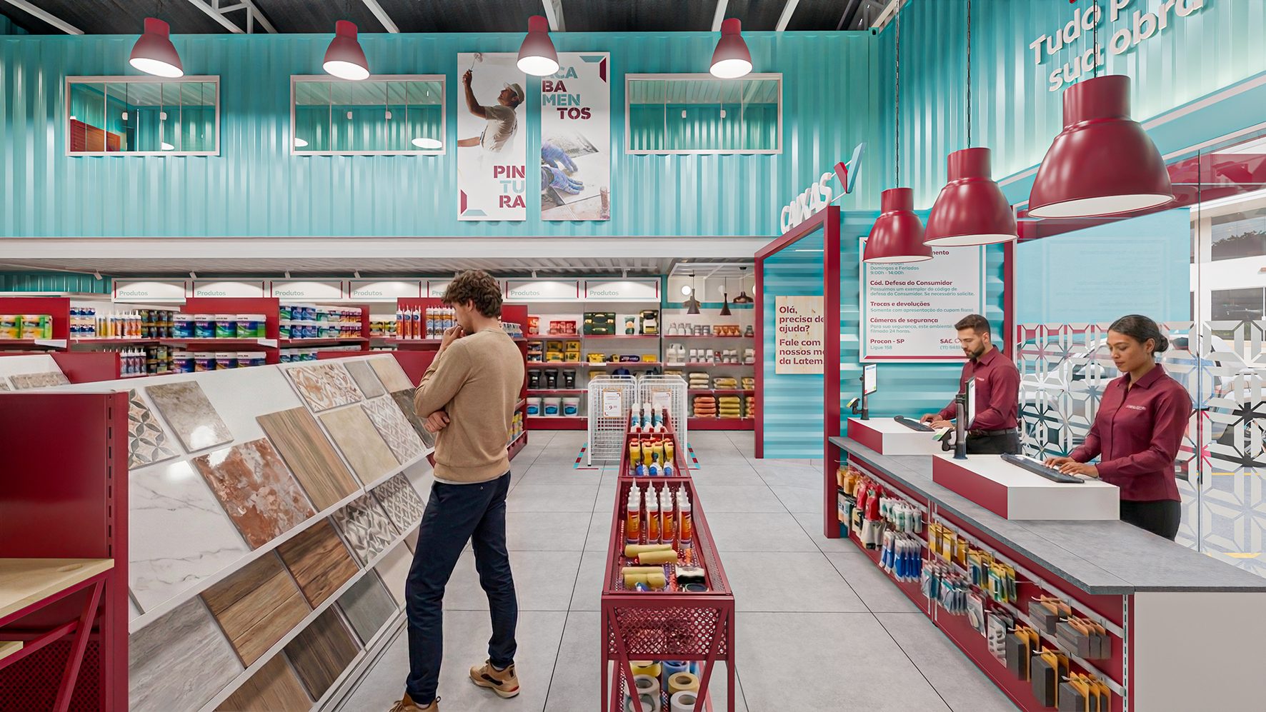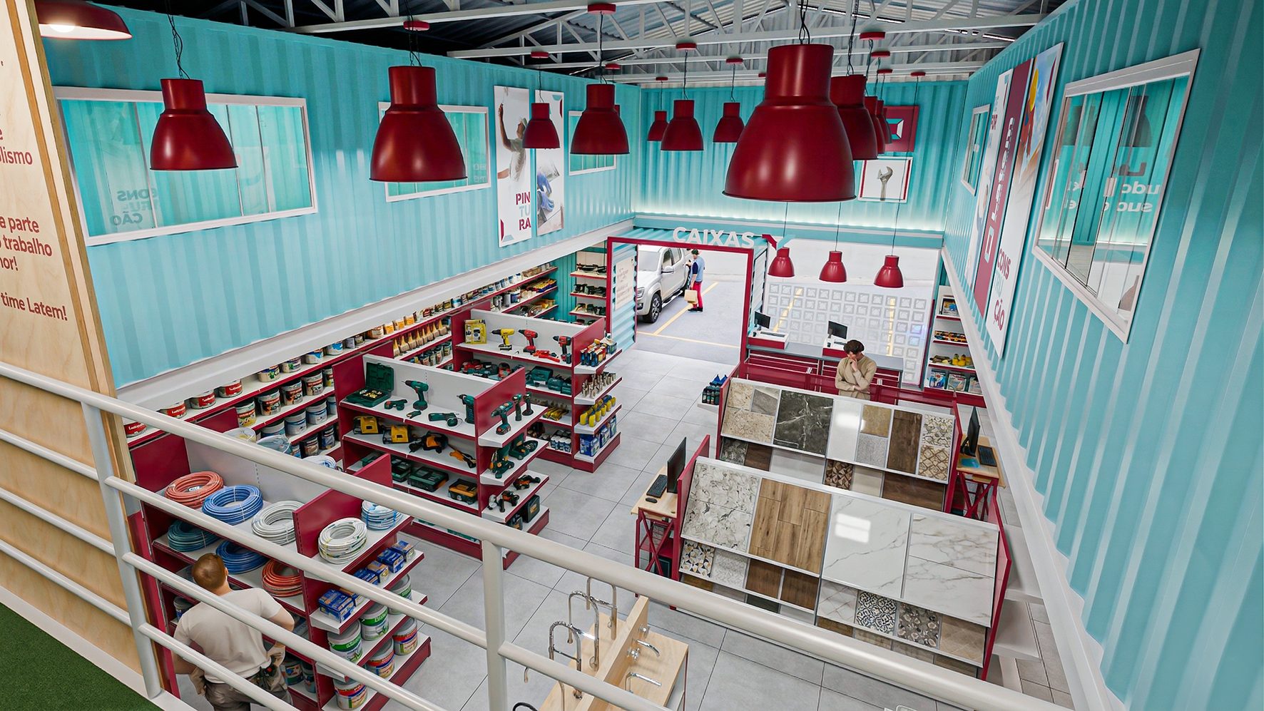 Na fase do conceito de loja a arquitetura foi estruturada em contêineres, detalhe que trouxe personalidade a loja e que possibilitou uma área central com um pé direito duplo, trazendo uma maior dimensão ao espaço interno que foi bem explorado pela iluminação e comunicação visual. Com um layout de loja pensado para favorecer um bom agrupamento das categorias e uma sequência de compras inteligente, utilizamos a comunicação visual com formas simples, complementando a experiência de compra para comunicar e sinalizar os setores e serviços oferecidos pela loja, que também conta com um mezanino com salas para cursos e treinamentos.